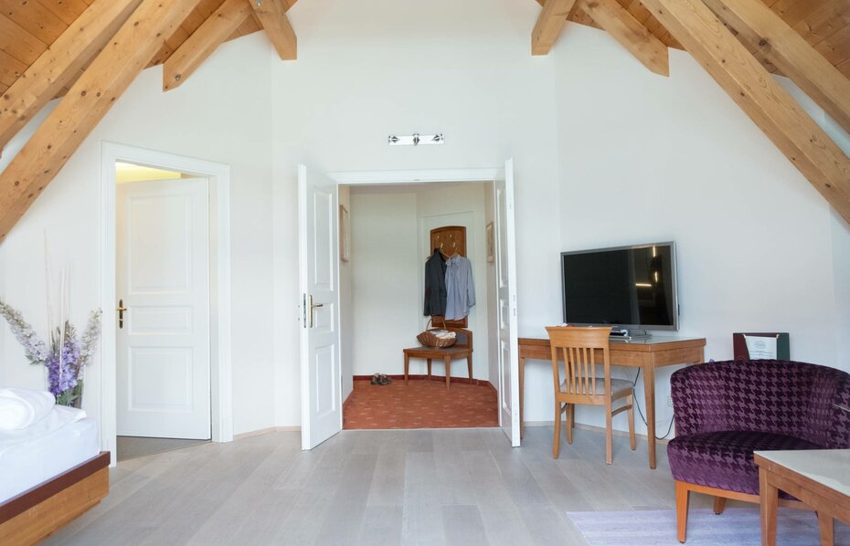 A unique experience awaits you in the elegant suite Wolfgangseeblick in the main building. On approximately 50 m² you can enjoy the lake view from your own private balcony. A harmonious combination of comfort and beauty! The suite includes a small single room - perfect for your family vacation on lake Wolfgangsee.